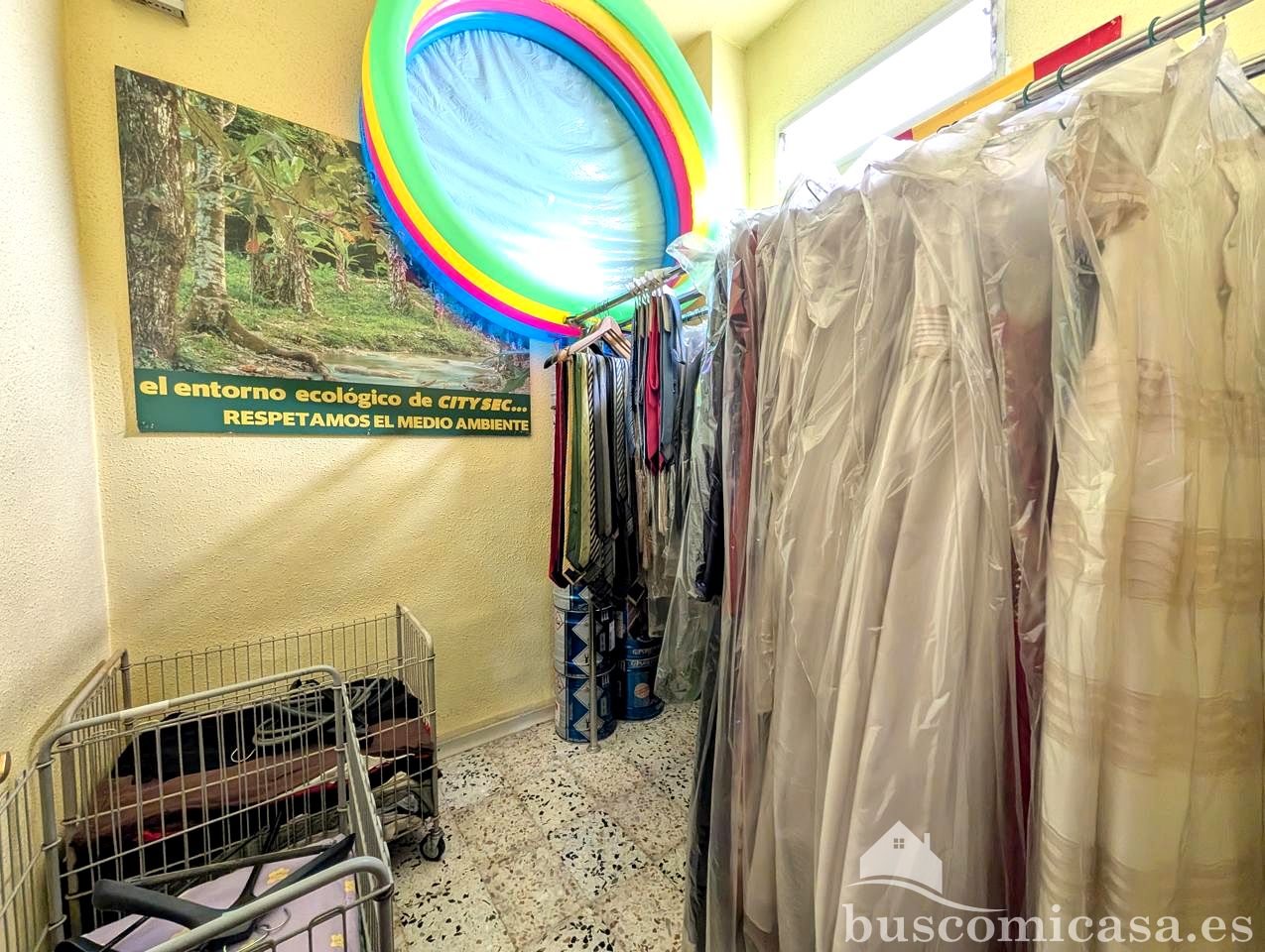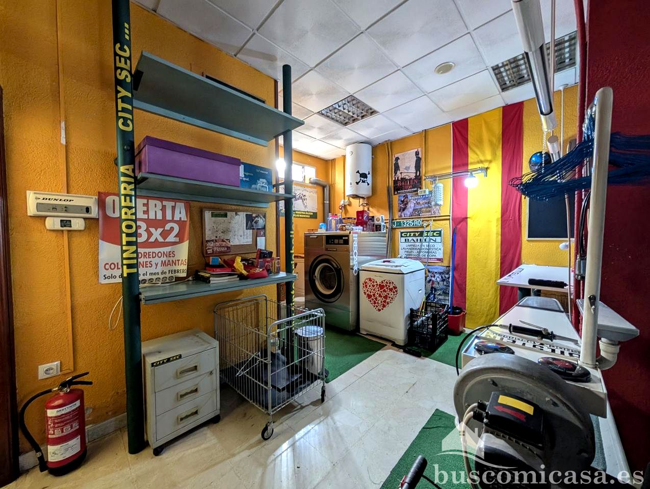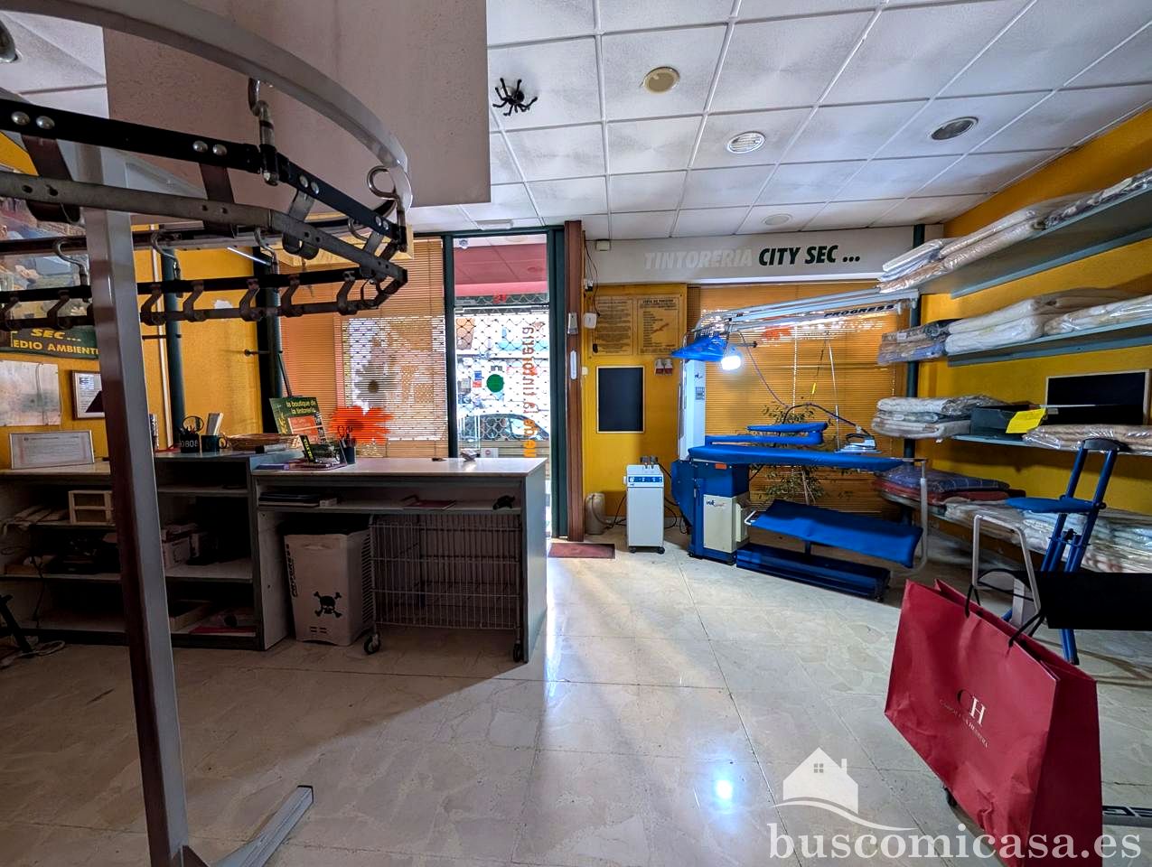 El local está listo para empezar el negocio de lavandería ya que se queda con todo el mobiliario: tres lavadoras, secadora, plancha profesional, dos percheros industriales, embolsadora manual industrial Artmecc Evolution, mostrador...